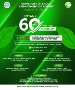 The Department of Botany, University of Lagos (UNILAG) is set to celebrate its 60th Anniversary, from Wednesday, October 8 to Thursday, October 9, 2025, at 10:00 a.m. daily at the Julius Berger Hall, UNILAG, Akoka.