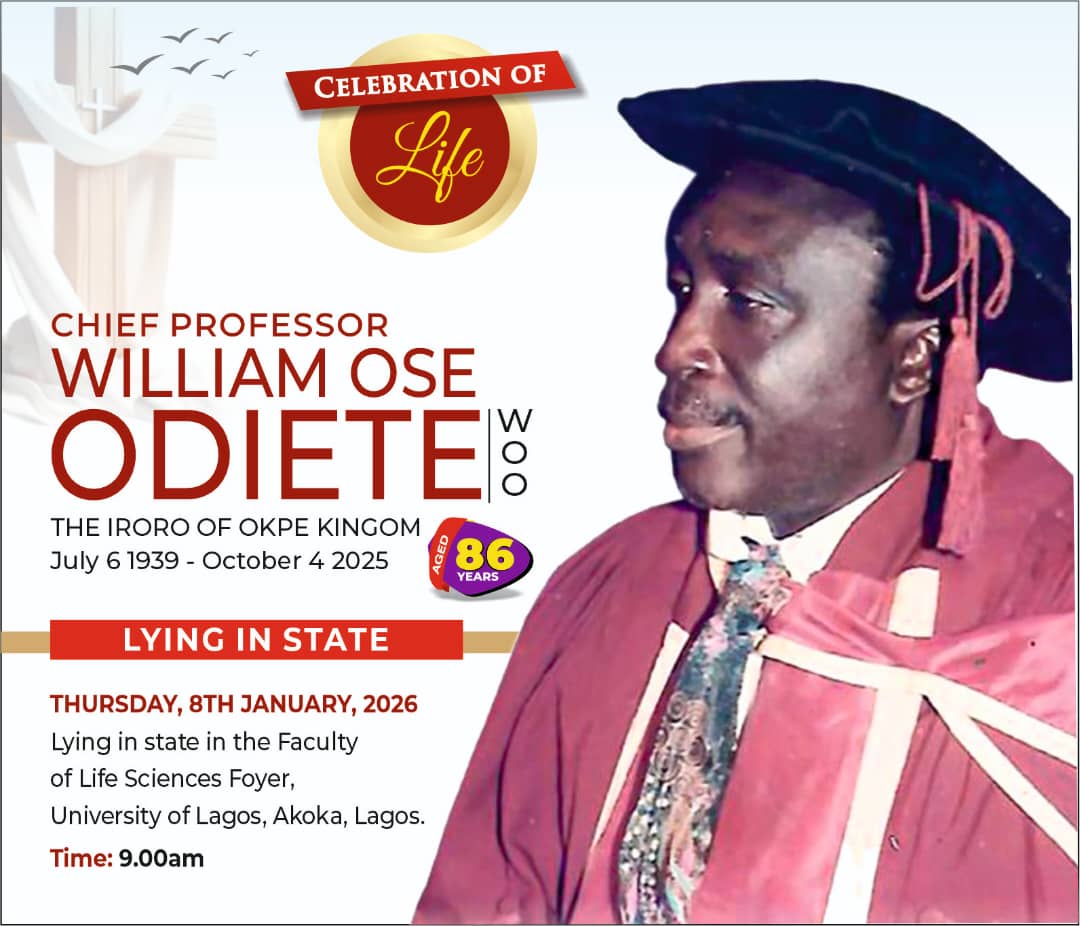 The Department of Zoology, University of Lagos (UNILAG) will host a Lying-In-State Programme for retired Professor William Ose Odiete, as part of his funeral ceremony following his demise on Saturday, October 4, 2025, at the age of 86. The event will hold as follows: Date: Thursday, January 8, 2026 Time: 8:30 am Venue: Faculty of Science Foyer, UNILAG Main Campus, Akoka, Lagos. Following the lying in state is a Commendation /Requiem Mass at St. Thomas […]