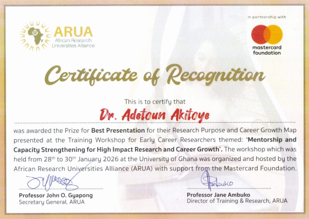 Earlier in the year, Dr. Akitoye also won the Prize for Best Presentation at the ARUA Mastercard Foundation Early Career Researchers Regional Training Workshop in Ghana. This recognition highlighted her clarity of vision, commitment to excellence, and the importance of mentorship in academic success.