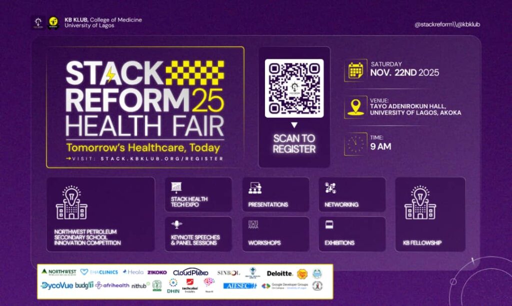 The KB Klub, an exclusive and philanthropic medical students’ club of the College of Medicine, University of Lagos, will host its flagship event, The Stack Reform Health Fair 2025, on Saturday, November 22, 2025, at 9:00 a.m. at the Tayo Aderinokun Hall , University of Lagos, Akoka.